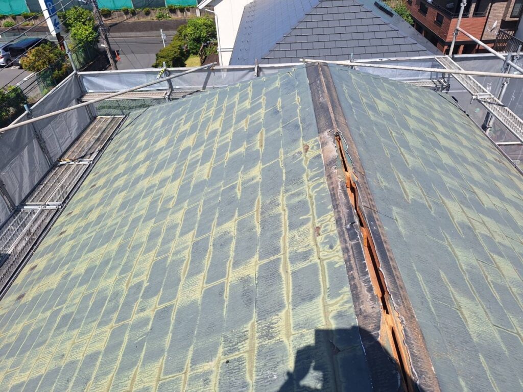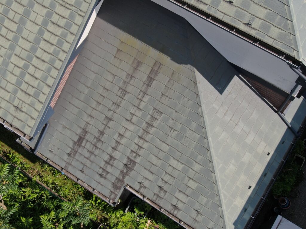 施工前は、屋根全体に色あせや防水層の劣化が見られ、表面の撥水性も低下している状態でした。